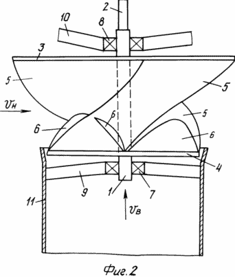 На вертикальной несущей трубе 1 с осью 2 для соединения с электрогенератором жестко закреплены верхний сплошной пояс 3 и нижний пояс 4 в виде колеса со спицами. Между поясами 3 и 4 размещены наклонно по винтовой линии изогнутые по дуге секторы 5. На нижнем поясе 4 закреплены наклонно лопатки 6 по числу секторов 5. Ветроагрегат свободно вращается в подшипниках 7 и 8, которые с помощью кронштейнов 9 и 10 крепятся к несущей конструкции ветроагрегата (не показано). К нижнему поясу 4 примыкает с небольшим зазором труба-воздуховод 11 восходящего воздушного потока VB. Диаметр трубы 11 в ее верхней части равен диаметру колеса нижнего пояса 4.