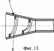 Воздухозаборник 7 может быть выполнен с внутренней конической поверхностью, снабженной лопатками 8 (фиг.4, 13), установленными под углом к продольной оси воздухозаборника 7.