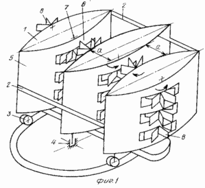Чередование ветроколес соседних валов в предложенном устройстве позволяет уменьшить расстояние между валами до суммы радиусов ветроколеса и вала, снизить площадь лобового сечения конфузоров и повысить тем самым коэффициент использования энергии ветра. Кроме того, в предложенной конструкции на расстояние между валами не влияют ни число рабочих лопаток, ни их форма, что и способствует оптимизации этих параметров и повышению КПД ветроагрегата.