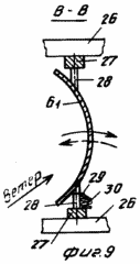 На осях 28 и закреплены рычаги поворота 29, с одним из которых соединена пружина 30 управления ветровой нагрузкой. Рычаги 29 соединены между собой тягой 31 синхронного поворота.