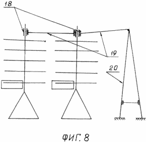 Кроме того, на одну или несколько сопрягающихся поверхностей устройств фиксации 7 лопастей 3 нанесен один или несколько слоев демпфирующих устройств в виде слоев демпфирующих материалов, что позволит избежать соударений элементов устройств фиксации 7 лопастей 3 при соединении друг с другом. Кроме того, вал 2 установлен в дополнительных подвижных опорах 18 (см. фиг.8). Дополнительная подвижная опора 18 одного ветряного многолопастного двигателя прикреплена жестким элементом 19 за дополнительную подвижную опору 18 другого ветряного многолопастного двигателя, которая в свою очередь прикреплена за опору 20 еще одним жестким элементом 19. Соединение ветряных многолопастных двигателей между собой и дополнительное крепление их за прочные опоры 20 обеспечивает высокую прочность и устойчивость конструкции к сильным ветровым нагрузкам.