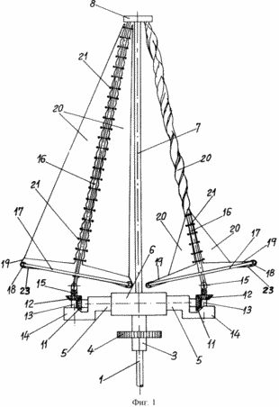 Внутри каждой втулки 5 находится вал 9, установленный в подшипниках 10. На обоих концах вала расположены конические зубчатые колеса 11, соединенные с точно такими же коническими зубчатыми колесами 12, расположенными перпендикулярно к первым таким образом, что центральное коническое зубчатое колесо 24 с вдвое меньшим количеством зубьев соосно соединено с верхней частью вертикального вала 1, в то время как зубчатые колеса 12, находящиеся в соединении с концами втулок 5, закреплены на вертикальных валах 13, установленных в блоках 14 посредством подшипников 22. В верхней части зубчатых колес 12, находящихся на вертикальных валах 13, имеются шарнирные соединения в виде шаровых шарниров 15, обеспечивающих определенный наклон верхней консольной части восходящего вала 16. На этом валу имеется крестовидная траверса 17, на концах которой предусмотрены шкивы 18 для крепления посредством пружин 23 или других упругих или гибких элементов 19 двойных лопастей 20, расположенных по обе стороны восходящего вала 16 с тросами 21, обеспечивающими натяжение двойных лопастей 20, имеющих форму сворачивающихся парусов.