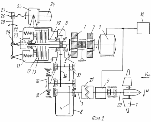 На чертежах и в тексте обозначено: лопасти ветроколеса 1; генератор 2; входной низкоскоростной вал мультипликатора 3; большое зубчатое колесо мультипликатора 4; промежуточный вал мультипликатора 5; выходной высокоскоростной вал мультипликатора 6; маховик 7; многоступенчатый (двух и более) мультипликатор 8; система управления положение лопастей ветроколеса 9; управляемый тормоз 10; выключаемая муфта сцепления 11; ведомый фрикционный диск муфты 12; ведущий фрикционный диск муфты 13; электродвигатель привода выключения муфты 14; редуктор привода выключения муфты 15; тормозные колодки 16; дополнительный быстроходный вал мультипликатора 17; выходной элемент выключаемой муфты 18; выходной элемент выключаемой муфты 19; полный вал ветроколеса 20; зубчатая муфта 21; пружина 22; нажимной элемент 23; электродвигатель привода выключения муфты 24; редуктор 25; винт 26 гайка 27; рычаг 28; толкатель 29; большая шестерня промежуточного вала мультипликатора 30; малая шестерня промежуточного вала мультипликатора 31; система управления ВЭУ 32.