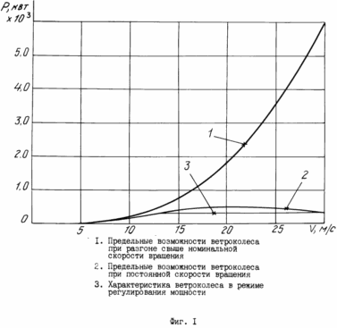 - предельно допустимой скоростью, до которой может разгоняться ветроколесо, после достижения которой из-за возросшей мощности торможение будет невозможно даже при приложении дополнительного момента Мт1, как это показано на фиг. 1, где изображенный график "1" иллюстрирует рост мощности в несколько раз при увеличенной скорости вращения, см. и фиг. 2, где изображен баланс поступающей мощности и мощности, затрачиваемой на торможение.