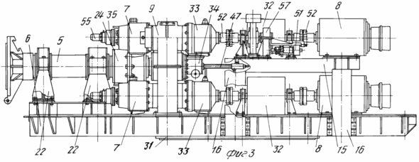 Момент, передаваемый муфтой 7, регулируется за счет регулировки величины осевого усилия поджатия фрикционных дисков 43 и 44 с помощью нажимного элемента 29, состоящего из внешней невращающейся и внутренней вращающейся частей, поджатых пружиной. Включение выключение муфты 7 производится с помощью привода 35, включающего электродвигатель 55, редуктор, винт, гайку и связанный с ней толкатель с нажимным элементом 29 муфты (см. фиг. 5).