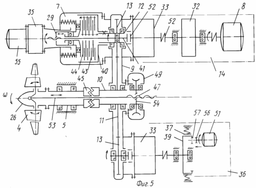 Корпус раздаточного многопоточного мультипликатора 9 выполнен силовым и на нем смонтированы выключаемые муфты 7, дополнительные автономные мультипликаторы 33 и привод 34 системы управления положением лопастей. Наличие мультипликатора в силовой цепи нагружения позволяет ему играть роль силовой плиты, обеспечивая необходимую жесткость многоярусной пространственной конструкции рамы.