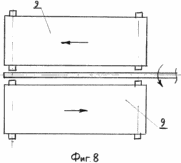 8. Устройство по п.2, отличающееся тем, что оно снабжено, по меньшей мере, одним дополнительным вращающимся энергопреобразующим элементом, выполненным в виде двух соосно расположенных приводных дисков, установленных с возможностью синхронного вращения в противоположных относительно друг друга направлениях аналогично основному энергопреобразующему элементу и размещенным по отношению к нему так, что ось синхронного вращения дисков дополнительного энергопреобразующего элемента расположена перпендикулярно оси синхронного вращения дисков основного энергопреобразующего элемента.