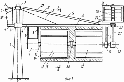 Внутри, в тело барабанов 12 и ограничителей 16 заделаны электропроводные рамки 17 и 18, взаимодействующие с магнитной индукцией В. Барабаны 12, пластины 14, шарниры 15 и ограничители 16 выполнены из немагнитного материала. К верхнему тросу 5 прикреплены две треугольной формы солнечные батареи 19 и 20, скрепленные между собой шарниром 21, а к балке 4 - кронштейнами 22. На конце балки 4, в отверстии с подшипником 23 установлен карусельный ветродвигатель, состоящий из рамы 24 с поворотными пластинами 25, укрепленными на осях 28, вертикального вала 27, соединенного с редуктором 13. Опорный подшипник 28, установленный в средней части двустороннего магнита 8, контактирует через вал 11 с барабанами 12. Перпендикулярно оси вала 11 к концу балки 4 и подшипнику 10 жестко прикреплена вертикальная солнечная батарея 29. Левая часть карусельной гелиоветростанции аналогична правой части и состоит из тех же самых составных элементов и устройств.