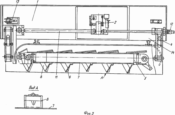 Второй конец пластины с той же лентой соединен двумя гибкими связями 8, причем эти связи закреплены на пластине таким образом (Фиг 3. Вид А), что центр пластины получается в виде кармана. При воздействии потока реки на пластины и ее карман он отгибает ее от ленты на определенный угол, ограниченный длиной гибких связей, и пластина вместе со связями приобретает форму ковша, развернутого против течения реки. На раме турбины 5 закреплен конический редуктор 9, который жестко связан с ведущим туером транспортера турбины и через цепной редуктор 10 валом 11 связан с приводом генераторов 2. Вал 11 проходит через всю станцию и оканчивается вилкой карданной передачи 12, позволяющей подключать к головному блоку станции дополнительные турбины, увеличивая тем самым мощность станции до заданных пределов.