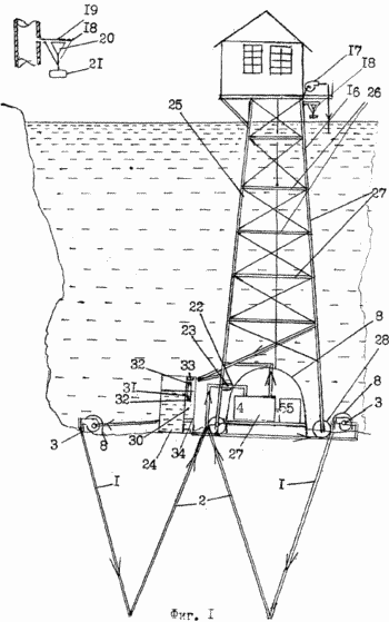 Механическая энергия преобразуется в электрическую энергию при помощи генератора 5. Электрическая энергия из генератора перемещается по кабелю 15 потребителям 14, расположенным на море и суше. С судна подается воздух под колокол 8. Колокол 8 защищает машины: насос 3, турбину 4, генератор 5 от высокого давления воды на дне моря и создает нормальные условия для работы машин. Отработанный пар перемещается из турбины 4 в трубу конденсатора 16. От действия холодной воды моря водяной пар охлаждается и превращается в конденсат, он при помощи насоса 3 перемещается в трубу скважины. При поломке одной из машин в колоколе с судна опускают на дно моря роботов, с помощью пульта управления управляют работой роботов, откручивают муфты, отделяют патрубки, соединяющиеся с колоколом 8 и трубами 1 и 2 скважин. С помощью подъемных средств производят подъем колокола на судно или платформу, отделяют колокол от площадки 7, производят демонтаж, ремонт или замену изношенных деталей или узлов машины и монтаж, плотное и герметичное соединение площадки 7 с колоколом 8. Затем колокол 8 перемещают в исходное положение на дно моря. При помощи роботов /на чертеже не показано/ производим соединение труб при помощи муфт и снова производим замыкание электрической цепи, питающей электрический насос 3, вакуум-насос 17. Далее все операции повторяются. Как только пониженное давление надлежащего параметра достигнет превышения допустимых параметров, конус 20 перемещается снизу вверх, перемещая вверх подвеску 21, отверстие в клапане открывается, воздух перемещается в трубу. Давление в трубе нормализуется. Конус 20 с подвеской 21 перемещается сверху вниз в исходное положение. Клапан закрывается. Далее все операции повторяются.