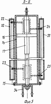 В вертикально расположенном цилиндре 14 нижний торец открыт и снабжен фланцем для крепления крышки 15, а на дне имеется кронштейн с отверстием для шарнирного крепления к верхней части рамы 4 с помощью оси.