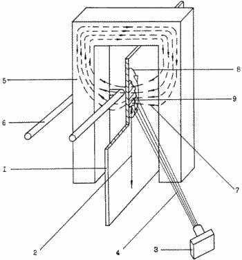 Кольцевой электрический ток 8, протекающий в сверхпроводящем слое статора 1 вокруг "нормальной зоны" 9, можно получить следующим образом. На находящемся в сверхпроводящем состоянии (охлажденном до температуры ниже Т-критической) сверхпроводящем слое статора 1 путем нагрева определенной его области, не граничащей с краем пластины, до температуры выше Т-критической создают "нормальную зону" 9 (не обладающую сверхпроводящими и диамагнитными свойствами). Далее берут кольцо из проводящего материала и приближают к центру его окружности один из полюсов постоянного магнита. Так как магнитные силовые линии пересекут проводник, то в нем наведется э.д.с. и потечет кольцевой ток, который быстро затухнет. После этого проводящее кольцо вместе с магнитом прикладывают к сверхпроводящему слою статора 1 таким образам, чтобы оно по всей окружности имело электрический контакт со сверхпроводником, а "нормальная зона" 9 располагалась напротив отверстия кольца. Сверхпроводник, обладая диамагнитными свойствами, не пропустит магнитное поле внутрь себя и силовые магнитные линии в значительной мере сконцентрируются в проводящем кольце. Затем магнит убирают. Силовые магнитные линии, пересекая проводник, наведут в нем э.д.с.и вызовут кольцевой электрический ток. Поскольку проводящее кольцо по всей окружности имеет электрический контакт со сверхпроводником, а электрический ток течет по пути наименьшего сопротивления, то кольцевой ток, наведенный в проводящем кольце, практически мгновенно переместится в сверхпроводник, окружающий "нормальную зону" на сверхпроводящем слое статора. После этого проводящее кольцо отделяют от сверхпроводящего слоя статора. Так как проводник не имеет электрического сопротивления, то кольцевой ток 8 будет циркулировать вокруг "нормальной зоны" 9 не затухая.