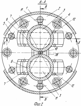 Перемещение двух шаров-индукторов 3 относительно друг друга по кругу вокруг оси 10 вращения предусмотрено для установки их работы в противофазе, т. е. для максимальной компенсации центробежных сил друг друга, возникающих при их вращательном движении.