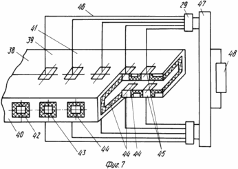 После того как симметрично расположенные вспомогательные рабочие камеры 22 поменяются местами, электропроводящая жидкость 27 в полых спицах 39, соединяющих внешние рабочие полости 24 вспомогательных рабочих камер 22 спаренных шаров-индукторов 3, движется в противоположном направлении относительно стенок 40 и 41 полых спиц 39, через сосредоточенное магнитное поле постоянных электромагнитов 43, закрепленных в окнах 42, причем окна 42 и спицы 39 внутри изолированы электроизоляционными прокладками 44, вызывают возникновение переменного электрического напряжения на электродах 45, которое передается по проводам 46 через коллекторы 29 на выпрямитель 47, а последний передает выпрямленный ток потребителю 48 электроэнергии.