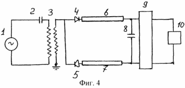 На фиг.4 электрическая энергия вырабатывается генератором высокочастотных колебаний 1 и поступает на выпрямляющие диоды 4 и 5 от повышающего трансформатора Тесла 3 через резонансный контур 2. Электрическую энергию передают на выпрямленном токе и напряжении с использованием диодов 4 и 5 и двух независимых однопроводных линий 6 и 7. По линии 6 через диод 4 передают положительную полуволну тока и напряжения, а по линии 7 через диод 5 передают отрицательную полуволну тока и напряжения. Концы однопроводных линий 6 и 7 присоединены к емкостному накопителю 8, к которому через электронный ключ 9 подключена нагрузка 10.