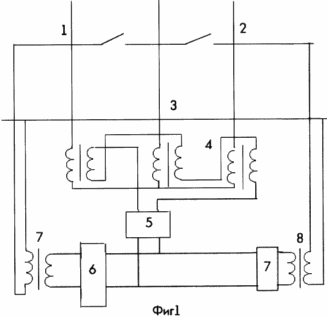 На фиг.1 и 2 - соответственно опережающая и отстающая фазы, 3 - рельсовое полотно, 4 - трансформатор, первичная обмотка которого соединена в звезду, вторичная обмотка в открытый треугольник, 5 - выпрямитель, 6, 7 - соответственно инверторы, ведомые сетью опережающей и отстающей фаз, 8, 9 - однофазные трансформаторы.