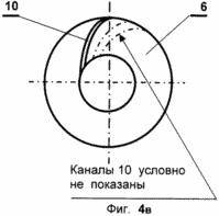 Корпус 6 может иметь выгнутую (фиг. 2), коническую (фиг. 3а) или вогнутую (фиг. 3б) внутреннюю поверхность, на которой выполнены каналы 10 прямоугольного или квадратного сечения. Каналы 10 могут располагаться радиально (фиг. 4а), с наклоном (фиг. 4б) или криволинейно (фиг. 4в).