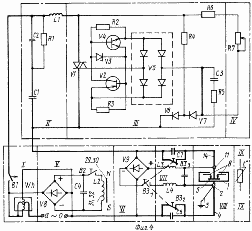 Согласно фиг.4 блок питания имеет (узел I) электросчетчик Wh и пускатель В1, фильтр от радиопомех (узел II) с катушкой индуктивности LI и емкостями С1 и С2, тиристорный регулятор напряжения (см. узел III) с потенциометром R7 (узел IV), выпрямитель У8 с выключателем В2, емкостью С4 и индуктивностью L2 (узел V) для питания обмоток 32 и 33 (фиг.3) переносного электромагнитного ключа, выпрямитель У9 (узел VI) с выключателем В31, выключателями В32 и В33, блокирующими емкости С6 и С7 при отключении от выпрямителя У9 электроводонагревателя выключателем В31, фильтры (узел VII) от электрического тока с частотой 50 Гц в цепи выпрямителя У9 с индуктивностями L3, L4 и емкостью С5, а и с емкостями С6 и С7 в цепи фазного и нулевого проводов сети переменного тока для исключения постоянного тока в цепи переменного тока с частотой 50 Гц, электроводонагреватель (узел VIII) и фиг.1), терморегулятор (узел IX) для автоматического отключения и включения пускателем В1 блока питания в зависимости от заданных максимальной или минимальной температур воды в системе отопления или окружающей среды в помещении.