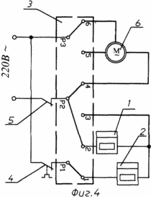 При положении 2 переключателя 3 (фиг.3) электродвигатель 6 отключен. Первые выводы 1 и 2 соответственно ТЭНов 1 и 2 соединены соответственно с контактами Р1 и Р2 переключателя 3. Включенные последовательно ТЭНы 1 и 2 выделяют 0,25 мощности от общей тепловой мощности. Тепловентилятор работает в режиме естественной конвекции.