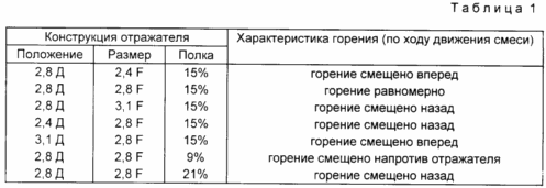 Таким образом, все заявляемые элементы горелки направлены на решение поставленной задачи снижение выбросов СО и NOx: выбранная конструкция отражателя, его параметры и параметры перфорированной насадки обеспечивают равномерное распределение газовоздушной смеси по поверхности насадки и, соответственно, равномерно распределенный узкий фронт горения, а выбранные параметры насадки и сетки обеспечивают полное сжигание газа в объеме камеры, образованной насадкой и сеткой. При этом минимальное время пребывания в зоне горения ведет к минимальным образованиям NOx, а сжигание в объеме с обратным излучением от сетки к насадке ведет к полному сгоранию газа без образования CO.