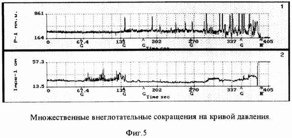 2. Больной А., 57 лет. Поступил с диагнозом: химический ожог пищевода 2 степени уксусной эссенцией. Было проведено облучение слизистой пищевода гелий-неоновым лазером - 10 сеансов. При контрольном обследовании визуально (ЭГДС) определяется недостаточность кардии, эрозивный рефлюкс-эзофагит. Выполнена эзофагоимпедансоманометрия (фиг. 3) На кривой импеданса отмечается резкое его снижение в надкардиальном отделе пищевода. Отмечается повышенная возбудимость мышц пищевода, когда в ответ на глоток возникает серия пиков на кривой импеданса, которой соответствует только один пик повышения внутрипищеводного давления. Имеются и внеглотательные сокращения на кривой импеданса при отсутствии изменения внутрипищеводного давления ("мерцание").