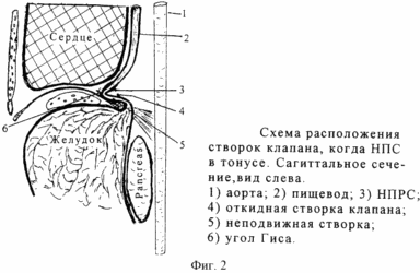![]() | Элементы, образующие клапан Губарева и принцип его антирефлюксной функции. Когда НПС в тонусе, задняя его стенка находится у передней стенки, в 3,0-х см кпереди от КПОД. ПЖП сомкнут и герметично прикрыт снизу передней стенкой кардиального отдела желудка, фиксированной к диафрагме и огибающей его спереди назад (неподвижная створка клапана). Задняя стенка кардиального отдела желудка лежит на передней и дополнительно герметизирует ПЖП (фиг.2). Во время акта глотания НПС расслабляется, но произвольно не расширяется. Его стенки раздвигает проходящая по пищеводу пища. Задняя стенка кардии и кардиального отдела желудка (откидная створка) отходит кзади и кверху. Пища беспрепятственно проходит в пищевод (фиг.3). НПС вновь приходит в тонус, замыкает кардию, приводит заднюю ее стенку к передней и "прячет" ПЖП за неподвижной створкой клапана. Откидная створка возвращается к неподвижной и герметизирует преддверие ПЖП (фиг.2). Кардия не ограничена извне и фиксирована к диафрагме лишь передним краем. Поэтому ее просвет расширяется до максимально возможного, а любая сила НПС оказывается достаточной, чтобы сомкнуть ПЖП и завести за неподвижную створку клапана. |