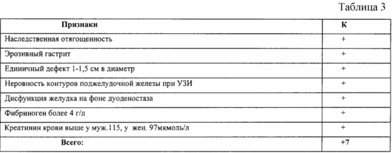 Недостатком приведенного выше способа прогнозирования является то, что не учитывались данные биохимического, морфологического и функционального обследования больного, отражающие сопутствующее поражение печени и поджелудочной железы, состояние которых изменяет течение ЯБ ДПК. Это обусловливает неточность предложенного способа и снижение его социально-экономической эффективности.