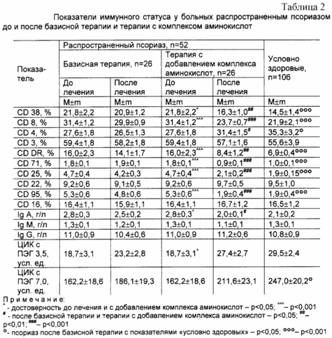 В качестве комплекса аминокислот для терапии используют комплекс аминокислот производства фирмы “Universal” (США) - “AMINO-1900” (№РОСС US.АЯ55.С00215 от 22.06.99). В таблице 1 приведена динамика индекса PASI у больных распространенным псориазом до и после традиционной терапии (8) и терапии с комплексом аминокислот, в таблице 2 - показатели иммунного статуса у больных распространенным псориазом до и после традиционной терапии и терапии с комплексом аминокислот.