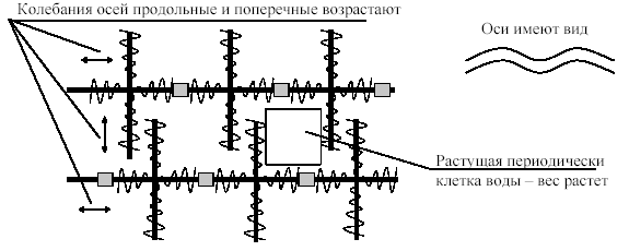 Рассмотрим процесс превращения воды в лед, то есть ее кристаллизацию. Мы уже говорили, что температура – это плотность носителей тепла. Носители тепла частично вовлекаются в движение гравитационного потока и становятся его составляющей. Основным носителем тепла для 1-го параллельного мира является нейтрон. При охлаждении плотность носителей тепла в воде уменьшается, что приводит к снижению скорости вращения иголок Кислорода в ее цепочках. Инерционные возможности масс иголок преодолевать магнитное отталкивание уменьшаются, и цепочки начинают сдвигаться параллельно друг другу, занимая положение, при котором медленно вращающиеся иголки одной цепочки располагаются напротив химсоединений другой цепочки (Рис.6), и так со всеми окружающими цепочками.