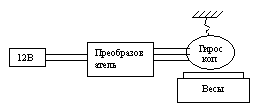 Стандартный гироскоп авиационного автопилота помещался на аналитические весы 2-го класса АДВ-200М. Вращающаяся часть гироскопа находилась в закрытом корпусе, при этом все конструкционные отверстия заклеивались. Масса гироскопа вместе с корпусом составляет 540 грамм. Гироскоп жестко крепился на чаше весов, причем для компенсации его веса предусмотрена пружинная система. Питание гироскопа осуществлялось напряжением 12 вольт через преобразователь на 3 фазы 400В. Переключатель позволял менять направление вращения гироскопа, Рис.1.