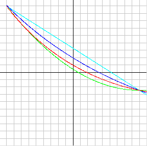 | Рис.9 Варианты движения тела в поле тяжести Земли, когда конечная точка траектории находится выше или ниже точки получающейся при движении по половине полной нулевой циклоиды. | Рис.10 Несколько вариантов траекторий, направления движения по которым в начальной точке не значительно отличаются друг от друга. |