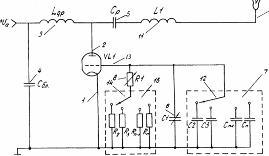Схема содержит генераторный триод VLI, катод 1, которого присоединен непосредственно к корпусу (земле). С источником постоянного тока (на схеме не указан) анод 2 соединен через дроссель L др3. Дроссель 3 и емкость 4 являются фильтром для высокочастотной составляющей анодного напряжения. Разделение постоянного и переменного тока в анодных и сеточных цепях обеспечивается дросселем Lдр 3, разделительными конденсаторами Cp 5, C16, блоком конденсаторов 7 и переменным резистором R1 8. Одноэлектродный разряд 9 через электрод 10, согласующую индуктивность L111 и через разделительную емкость Cp 5 соединен с анодом 2.