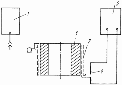 Генератор СВЧ 1 подключается к входу полосковой линии 2, размещенной на сердечнике 3, электроды 4 - к высоковольтному блоку 5 и к выходу полосковой линии 2.