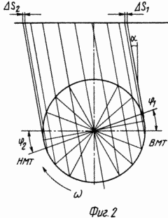 Расположение паза в поршне наклонным увеличивает неравномерность возвратно-поступательного движения поршней, таким образом, что в конце такта сжатия и в конце рабочего хода поршень останавливается в ВМТ раньше, чем центр шатунной шейки коленчатого вала пересечет ось цилиндра. Тем самым увеличивается (по углу поворота коленчатого вала) длительность движения поршня с минимальной скоростью в конце такта сжатия и в конце рабочего хода. Соответственно повышается скорость движения поршня на такте рабочего хода. Изложенное поясняется диаграммой (фиг. 2).