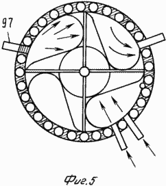 Каждая камера может быть выполнена в четвертом варианте. Четвертый вариант (фиг.5) такой же, как 1-3 варианты, отличается от них тем, что все стороны лопастей 6 спарены и изогнуты в одну сторону. Каждая камера в поперечном сечении имеет форму треугольника. Наружная сторона камеры описывает форму дуги цилиндра 4, внутренняя сторона выполнена в форме изогнутой линии. Высота треугольника выполнена в форме дуги.