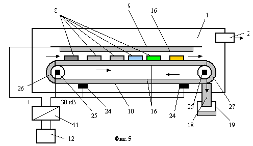 Устройство (фиг.5) работает следующим образом. Через загрузочное устройство (не показано) в камеру сушки транспортером, содержащем ленту-электрод 10, натянутую на барабаны 25, 26 вводят осушаемый пористый материал 8. После загрузки материала 8 в камеру 1 на электроды 9, 10 подают высокие электрические потенциалы от блока12 и создают электрическое поле в зоне сушки материала 8 Причем на электропроводящую ленту электрический потециал подают через специальный электрод-например подпружиненную угольную щетку 24. В результате возникновения электроосмоса влага выходит из материала , и впитывается в пористый адсорбент 16, который отжимается валками 26, 27, и затем ее удаляют из камеры 1через влагоприемник 18 в емкость 19, а пары влаги из камеры 1 удаляют устройством вытяжки 2. После этого процесс очушки завершают, а осушенный материал 8 через выгрузочный бункер (не показан) выводят за пределы камеры 1 и в нее транспортером загружают очередную порцию влажного пористого материала 8 . Данная конструкция устройства позволяет и осуществлять процесс непрерывной электроосмотической сушки пористого материала