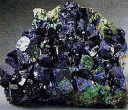 Свое название азурит получил по лазурно-синему цвету, а синоним - по составу. Блеск у него стеклянный. Встречается вместе с малахитом в зоне окисления месторождений меди или в непосредственной близости от них. Характерны агрегаты мелких сферолитов. Распространен на медных месторождениях Австралии, Чили, Мексики, СНГ (Урал, Рудный Алтай), США (шт. Аризона, Пенсильвания) и Франции (близ Лиона).