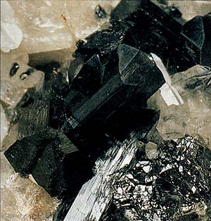 Представлен призматическими удлиненными кристаллами со штриховкой на гранях призмы. Чаще встречаются агрегаты игольчатых кристаллов с волокнисто-радиальной, иногда пучковатой структурой. Обладает хорошей спайностью и очень темной, почти черной, окраской, с блеском от смоляного до стеклянного на свежем изломе; на старом изломе кажется почти непрозрачным. Минерал тяжелый и твердый (с трудом царапается лезвием ножа).