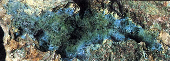 Кристаллы призматические, игольчатые, иногда объединенные в радиально-лучистые агрегаты. Цвет глубоко-лазурный и столь же разнообразный, как и у других минералов меди.