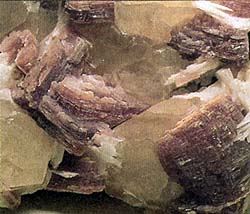 Лепидолит (литиевая слюда) - алюмосиликат. Блеск перламутровый. Непрозрачен. Цвета: розоватый, оттенки сиреневого до бесцветного. Черта белая. Спайность весьма совершенная. Листочки гибкие. Образуется в пегматитах и измененных гранитах. Представлен главным образом агрегатами мелких чешуек. Литиевая руда. Месторождения известны на юге Африки, США.