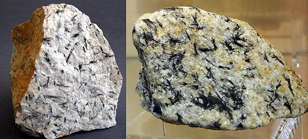 Справа. Людвигит (черные игольч. кр-лы до 1 см). Ахматовская копь, к С от Златоуста, Ю. Урал, Россия. Фото: © А.А. Евсеев.