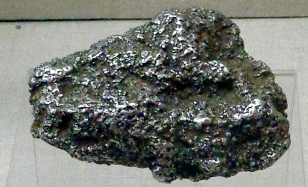 Платина (обычно с примесями железа - иридия, осмия, палладия). Блеск металлический, непрозрачна. Цвет серебряно-белый. Излом крючковатый, ковка. Спайность отсутствует. Образуется в ультраосновных породах. Накапливается в россыпях. Важным рудным минералом платины является сперрилит PtAs2. Кристаллы (кубической сингонии) редки; обычно платина представлена окатанными зернами или клубневидными самородками. Используется главным образом для лабораторной посуды, в электронике, электротехнике. Месторождения: Южная Африка, Канада, Урал, Аляска.