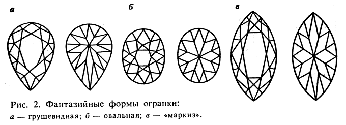Форма бриллиантов может быть различной, но чаще всего она круглая. Для крупных кристаллов используют формы: "маркиз", грушевидную, овальную, багет, "изумрудную" и др. При огранке драгоценных камней решающее значение имеют оптимальные углы наклона граней павильона. Если они не оптимальны, то большая часть лучей пройдет через камень, не отражаясь от нижних граней, и блеск камня будет тусклым, а цвет бледным. Чем большее число лучей света выйдет из камня, тем сильнее он блестит и сверкает. Показатель преломления различных цветных камней различный. Для каждого камня существуют свои критические углы наклона граней низа, которые определяются отношением