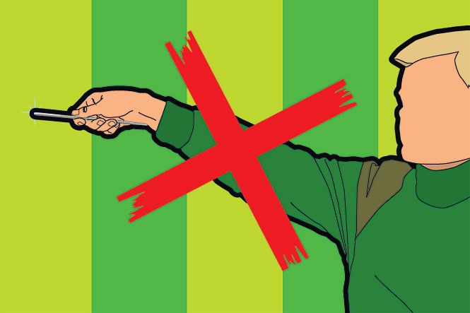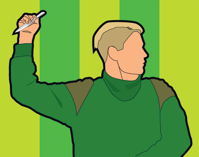 Обрати внимание на рисунок ниже. Именно таким образом, и никак иначе, должно быть зафиксировано твое запястье в миг вылета ножа из руки. Тебе непременно захочется опустить кисть вниз, так как разум будет уверен, что из такого положения клинок, находящийся почти перпендикулярно земле, обязательно упорхнет куда-нибудь вверх. Но ты не верь своим чувствам. Твой внутренний голос опять ошибается, как и в тот раз, когда советовал поставить все деньги на зеро.
